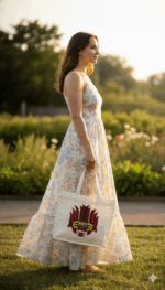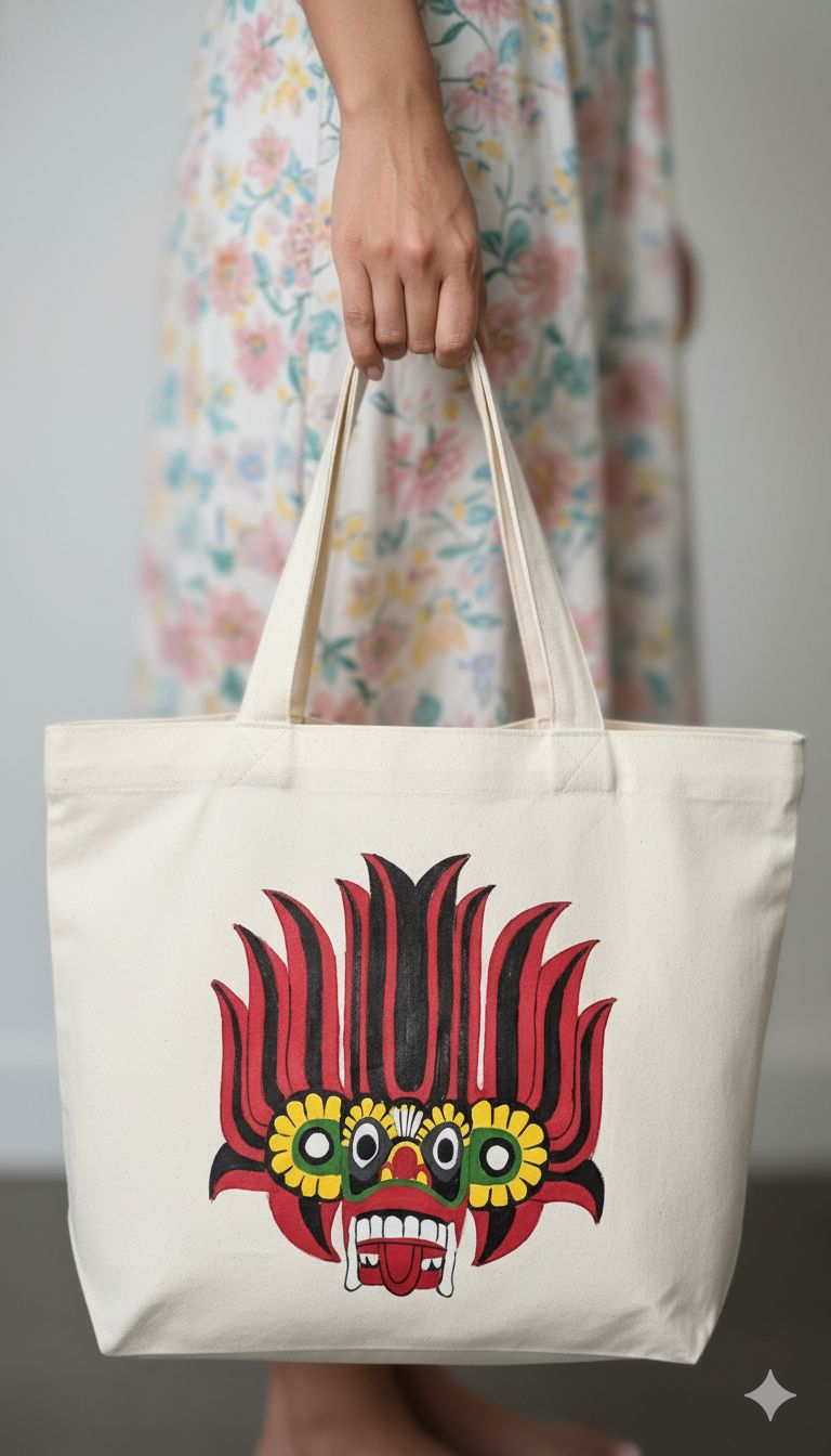 Carry the essence of Sri Lankan artistry with our Hand-Painted Bag, featuring a bold traditional devil (Yaka) design in striking red tones on an elegant off-white background.